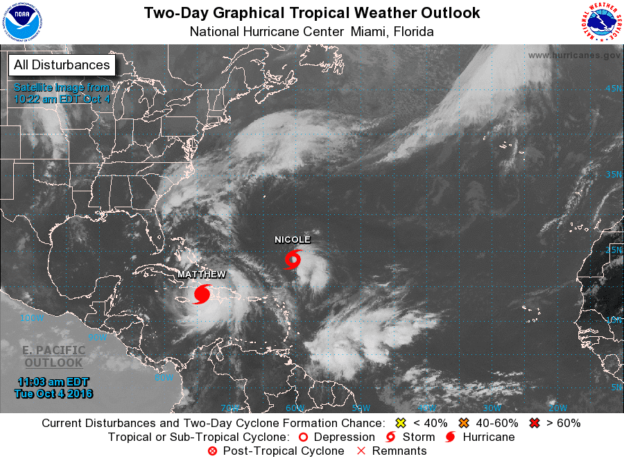 TROPICAL STORM NICOLA HAS POPPED UP TO JOIN HURRICANE MATTHEW, THOUGH SHE SEEMS TO BE STAYING OUT TO SEA, AT THE MOMENT :)